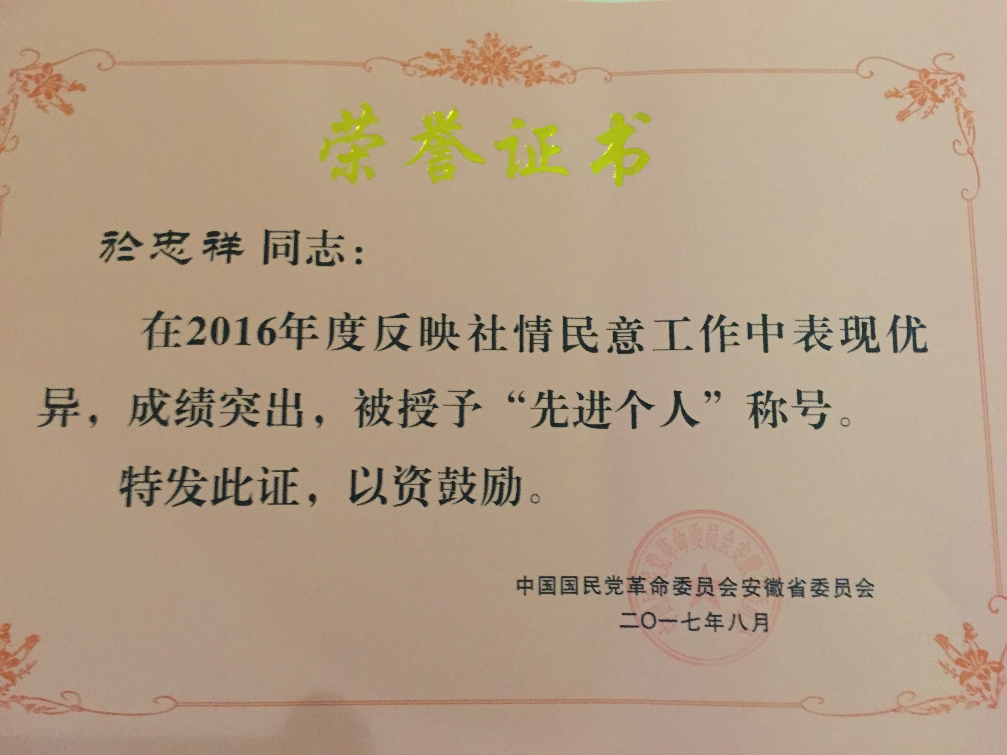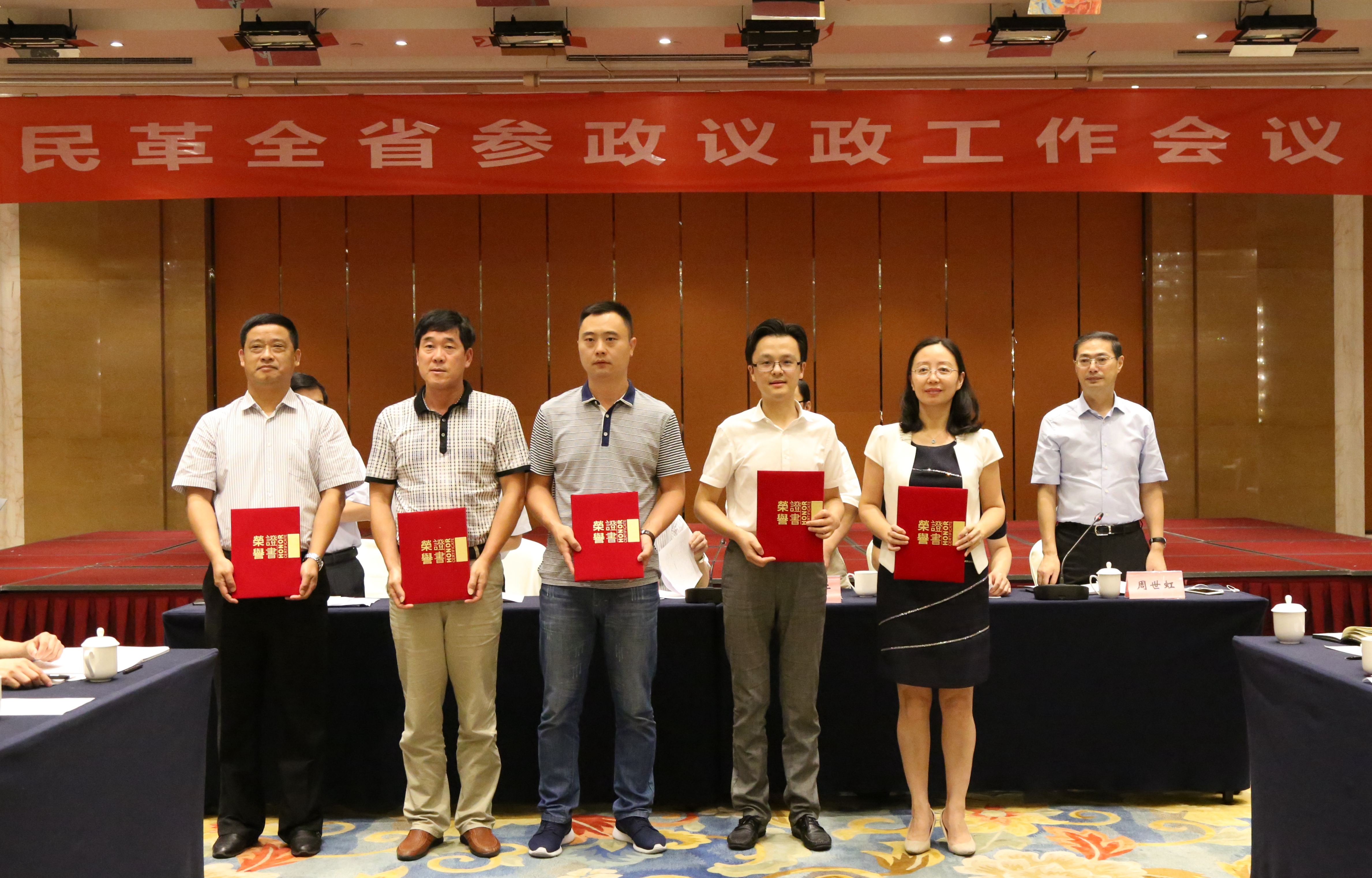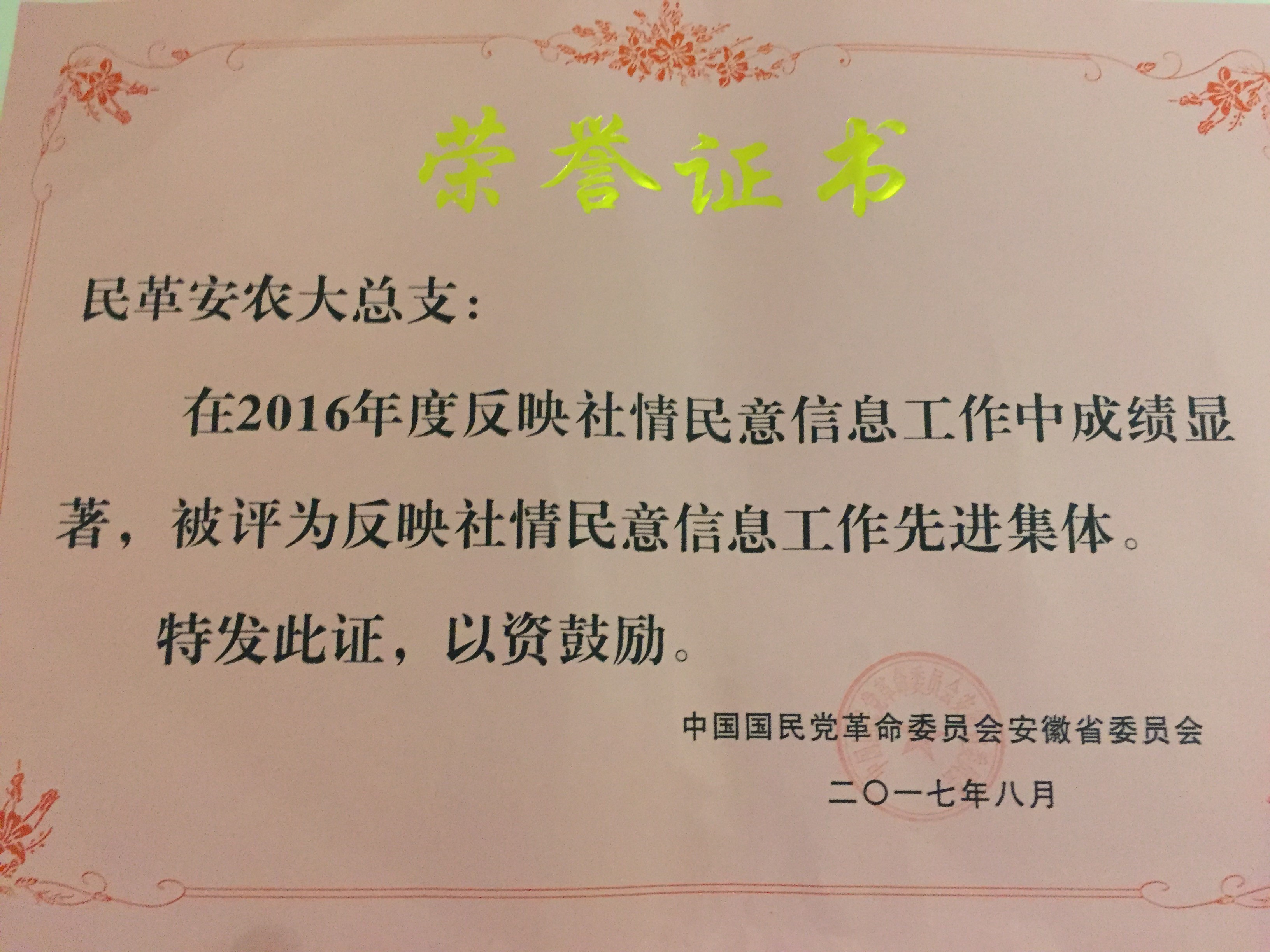 本网讯 8月26号, 民革安徽省参政议政工作会议在安徽合肥丰大国际大酒店举行,民革安徽农业大学总支副主委、安徽农业大学经济管理学院孟枫平教授参加会议。民革安农大总支被民革省委评为“2016年度反映社情民意工作先进单位”,主委於忠祥教授在2016年度反映社情民意工作中表现突出,被授予“先进个人”称号。於忠祥教授的提案《以土地改革为引擎 推进我省由脱贫攻坚向脱贫致富转变》被省委会采用并作为大会书面发言材料, 孟枫平教授和於忠祥教授合作撰写的《关于农业面源污染防治的若干建议》被省委会采用,并作为集体提案提交省政协十一届五次会议。(通讯员:何小佳)