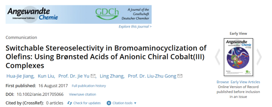 本网讯 近日,国际化学顶级期刊《德国应用化学》杂志(《Angew. Chem., Int. Ed.》,2016年影响因子为11.991)在线刊登了安徽农业大学理学院应用化学系俞杰副教授与中国科学技术大学化学与材料科学学院龚流柱教授合作发表的题为“Switchable Stereoselectivity in Bromoaminocyclization of Olefins: Using Brønsted Acids of Anionic Chiral Cobalt(III) Complexes”的最新研究成果(Jiang, H.-J.; Liu, K.;Yu, J.*; Zhang, L.andGong, L.-Z.*Angew. Chem., Int. Ed. 2017,56, doi:10.1002/anie.201705066)。俞杰副教授为共同通讯作者,安徽农业大学为第二及通讯单位。