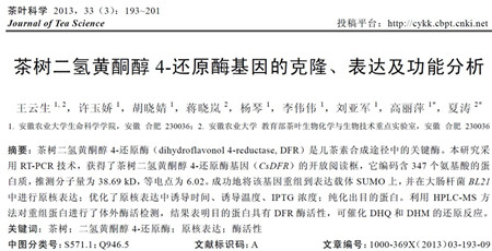 夏涛团队发表的《茶树二氢黄酮醇4-还原酶基因的克隆、表达及功能分析》(茶叶科学.2013,33(3):193-201)喜获二等奖。