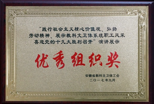 本网讯9月25日,安徽省教科文卫体工会“践行社会主义核心价值观、弘扬劳动精神、展示教科文卫体系统职工风采,喜迎党的十九大胜利召开”演讲展示在肥举行。我校柴霞老师以《牢记宗旨不辱使命》为题获得演讲展示二等奖,同时安徽农业大学教育工会获得优秀组织奖。