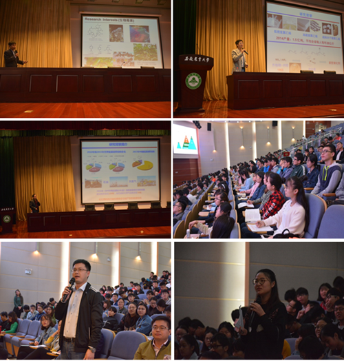 三位教授分别从面向高效转化的有机合成新方法研究、烯烃与极性单体共聚以及功能化聚烯烃的制备、超薄二维无机半导体的制备、表征及其在光还原二氧化碳中的应用等三个方面深入浅出地介绍了有机合成、高分子材料、无机纳米材料的应用前景和前沿发展方向。报告期间,与会同学积极踊跃地和专家们交流互动。