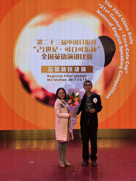 本网讯 11月18日,第23届中国日报社“21世纪·可口可乐杯”全国英语演讲比赛安徽赛区决赛在安徽工业大学落下帷幕。来自合肥工业大学、安徽大学等全省十余所高校的25名优秀选手参加了此次比赛的角逐。经过激烈比拼,我校外国语学院丁惠老师指导的2015级园艺专业张琳婕同学获大赛一等奖,张晟老师指导的2016级园林专业邵壮同学获大赛三等奖。
