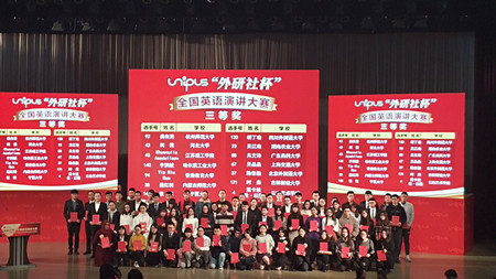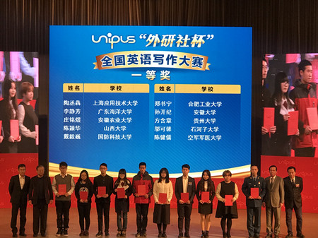 本网讯12月3日至8日,2017“外研社杯”全国大学生英语挑战赛(Uchallenge)全国决赛在北京外研社国际会议中心成功举办。经过激烈角逐,由颜志蓉老师指导的我校14级英语庄铭煜同学荣获写作大赛总决赛一等奖,由金君卫老师指导的我校15级法语刘璐同学荣获演讲大赛总决赛三等奖,创造了我校学子在该项赛事中的最好成绩。