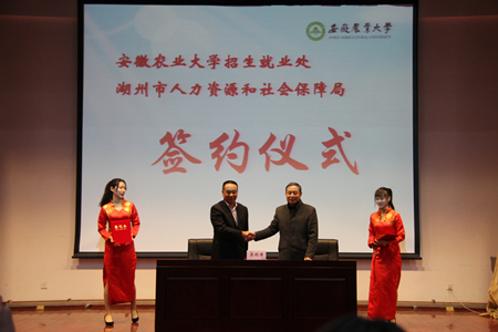 本网讯 12月26日下午,浙江省湖州市大学生就业创业新政安徽农业大学发布会暨深化拓展“9360”联盟校地人才合作签约仪式在我校图书馆第一报告厅举行。湖州市人力资源和社会保障局副局长沈福群带领湖州市2区3县人社系统负责人及企业家代表一行35人来校,校宣传部、教务处、学生处、招生就业处、团委负责人及各学院学生工作负责人、就业联络员老师等近500名师生代表参加了活动。活动由校招生就业处副处长沈兆梅主持。
