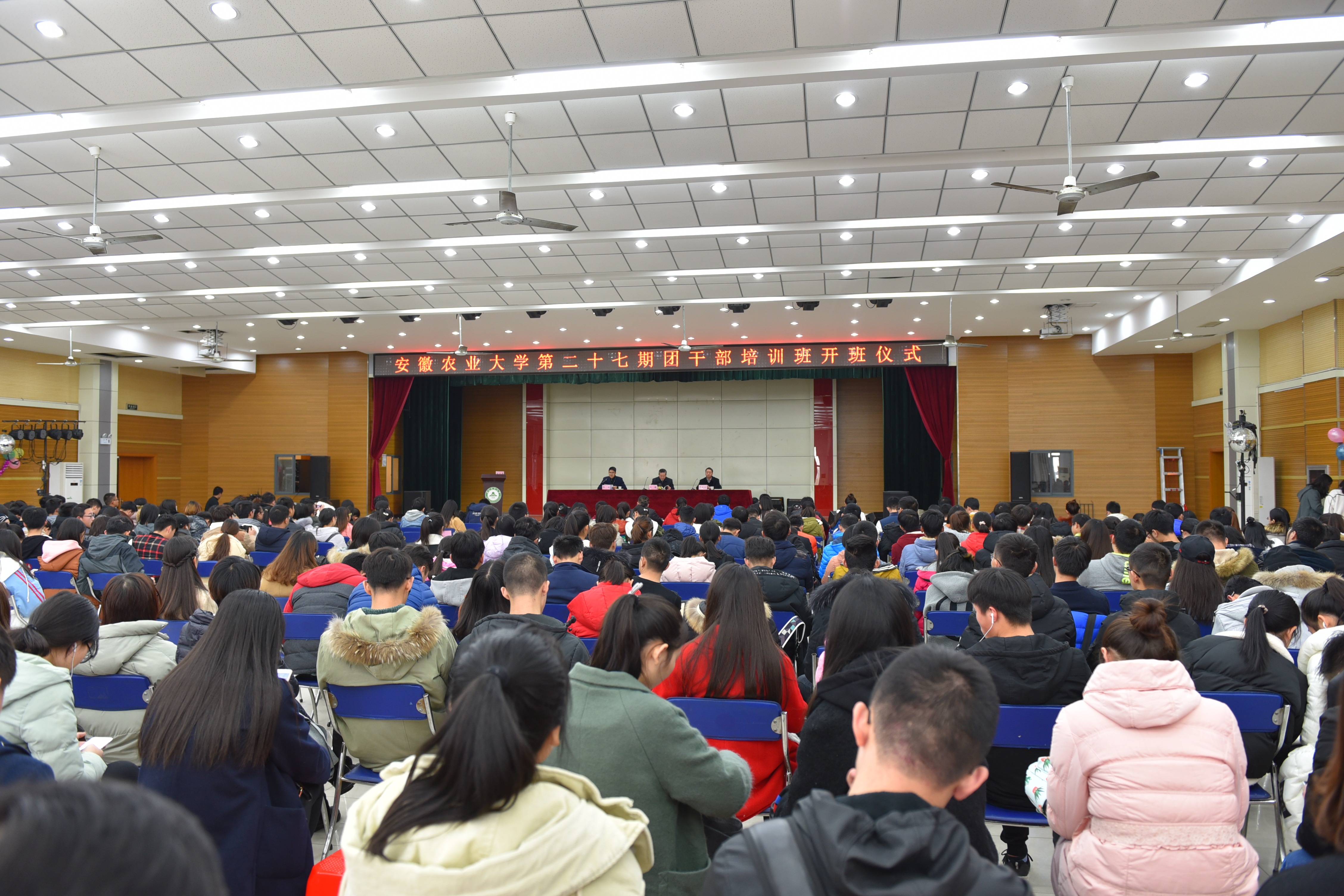本网讯 12月27日下午,我校第二十七期团干部培训班开班仪式暨首场报告会在欣苑四楼学生活动中心举行。校党委书记江春、学工部(处)部长彭庆刚出席会议。各学院团委老师,本期培训班全体学员共计400余人参加了会议。会议由校团委书记张健主持。