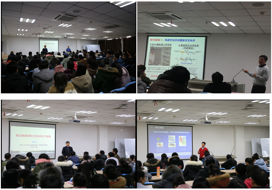 本次会议,王建、刘贤金、陈学新、方卫国分别作了题为《果蝇神经发育的分子调控》、《Cry毒素生物效应模拟物研究进展》、《寄生蜂调控寄生昆虫的分子机制》、《罗伯兹绿僵菌致病和耐热新机制》的学术报告。报告会上,四位专家与参会老师和研究生分享了在科研与学习方面的心得和感悟,集中展示了植物保护领域的研究进展和水平,会场气氛活跃、交流热烈,浓郁的学术氛围赢得现场师生的阵阵掌声,与会师生深受启发,获益匪浅。
