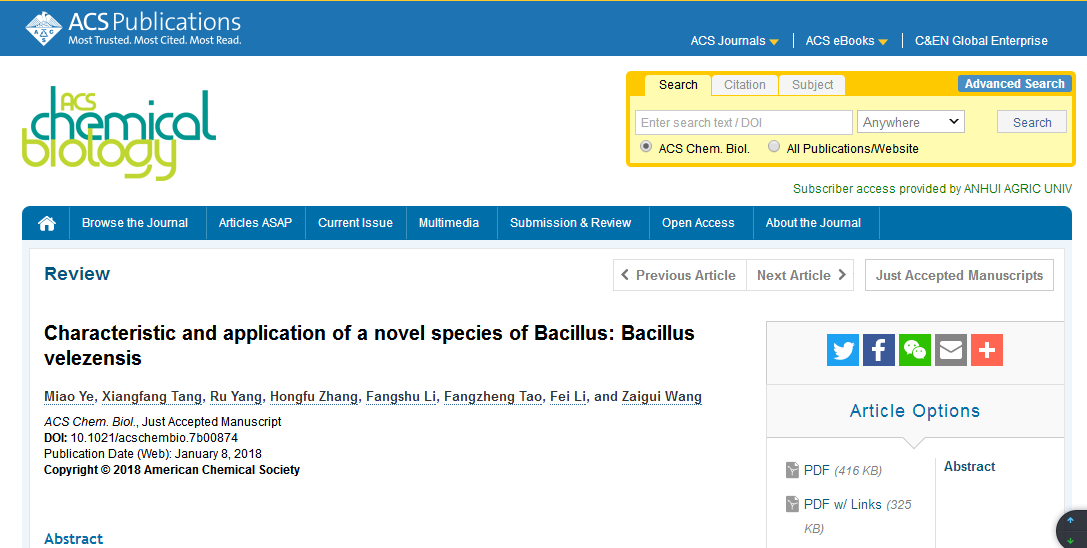本网讯近日,安徽农业大学生命科学学院蚕学与经济动物系王在贵副教授课题组在美国化学学会著名期刊ACS Chemical Biology(期刊近5年平均影响因子5.132)发表学术论文:“Characteristic and application of a novel species of Bacillus: Bacillus velezensis”。王在贵为该文的通讯作者,第一作者为其指导的研究生叶淼,安徽农业大学为论文第一单位。该课题组发现一株具有重要功能的益生菌,相关成果已申报了国家发明专利。