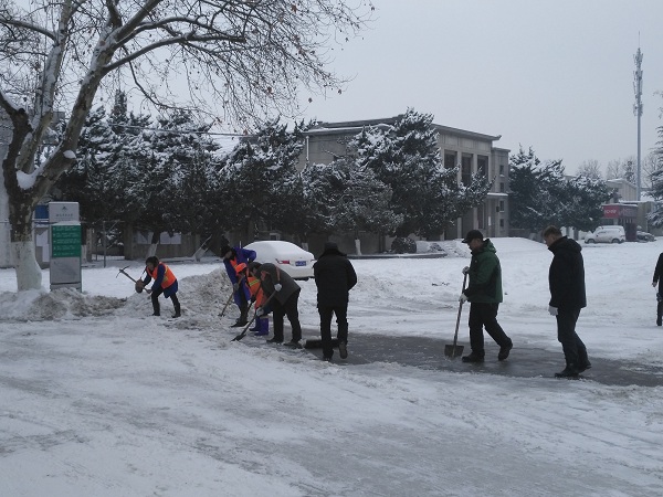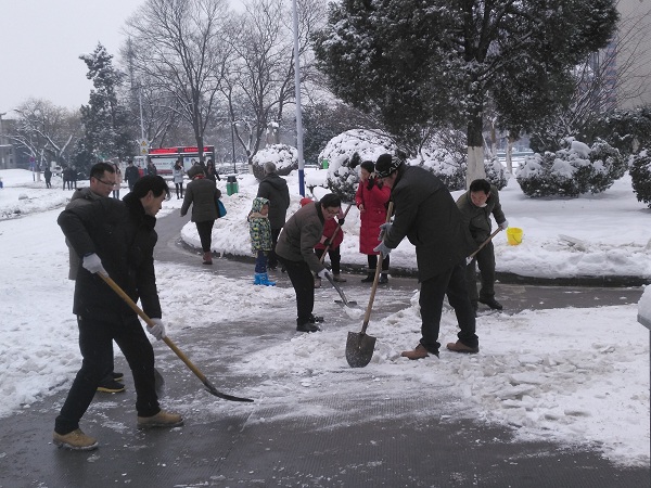 1月28日上午,大雪渐停,但校园内道路积雪情况仍不容乐观,总务管理处(基建办)全员集体与物业公司人员一起清理校内积雪,同时呼吁全体教职工共同参与及时清理校园积雪,共建平安校园,和谐校园。(何兵 通讯员:周晓娟)