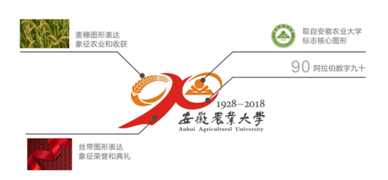 校庆标志由一条红色丝带贯穿而成,形成了一个无限符号,展现学校90年办学历程中的无数荣耀和光辉,拥有着无限的生命力。整体图形巧妙构成了“90”二个阿拉伯数字,代表了建校90周年特定的年份。标志中左侧图形中的麦穗,象征农业,表达了建校90年来丰硕的成果与收获;右侧图形中是校徽的核心记忆图形,象征着学校的专属性;标志中红色象征荣耀与喜庆,橘黄色寓意收获与成熟。整体标志和谐共生,由麦穗、校徽、数字、丝带、色彩等五部分构成,分别代表了“创新、协调、绿色、开放、共享”五大发展理念。