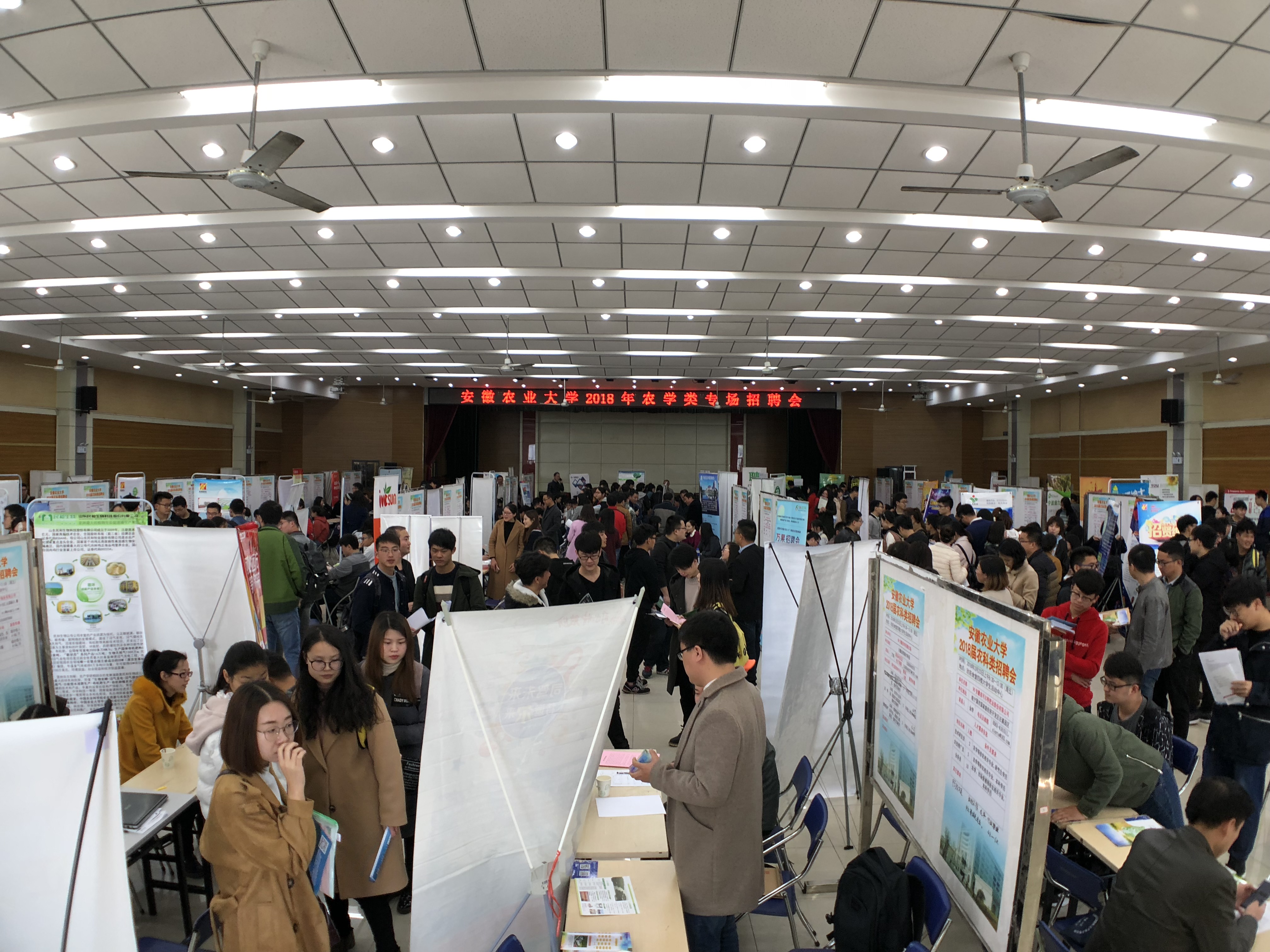 招聘会现场气氛热烈,吸引了包括安徽丰乐农化有限责任公司、安徽省农垦集团有限公司、河北威远生物化工有限公司、安徽江淮园艺种业股份有限公司、安徽久易农业股份有限公司、袁隆平农业高科技股份有限公司等一百多家省内外用人单位,提供了千余个涉农专业岗位。各用人单位通过宣传片、画报、展板等向毕业生介绍了公司的基本情况、招聘条件和发展愿景,并与毕业生做了面对面交流和沟通。