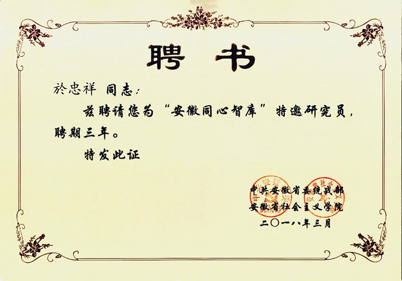 本网讯 3月20日上午,安徽省委统战部、安徽省社会主义学院举行“安徽同心智库”成立座谈会。省委常委、统战部部长刘莉出席会议并讲话,省政协副主席、省社会主义学院院长、安徽农业大学副校长夏涛出席会议。省政府参事、民革中央“三农”委员会副主任、安徽农业现代化研究院(省重点智库)首席专家、我校经济管理学院於忠祥教授被聘为首批特邀研究员。