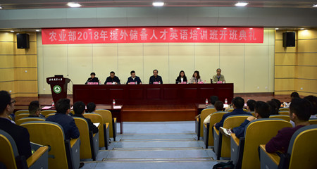 本网讯 3月27日,农业部第二期农业援外储备人才英语培训班在我校开班。农业部国际交流服务中心副主任蔺惠芳,农业部国际交流服务中心礼宾签证处处长洪志杰,交流合作处处长王静,项目官员李京,安徽省农委外事外经处处长韦艾平,副处级调研员闫玉玲,安徽省动物疫病防控中心援外专家刘华,我校党委常委、副校长蒋家平出席开班仪式。仪式由校国际交流合作处处长姜红主持,外国语学院党政领导姚莉、孙志农、黄庆华及全体学员、任课教师参加了活动。