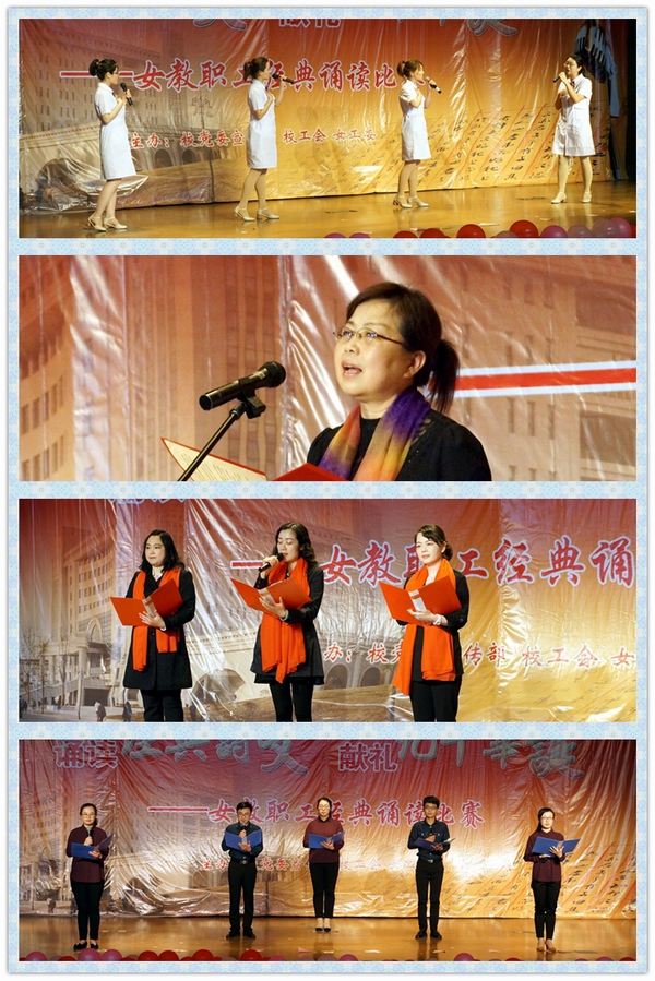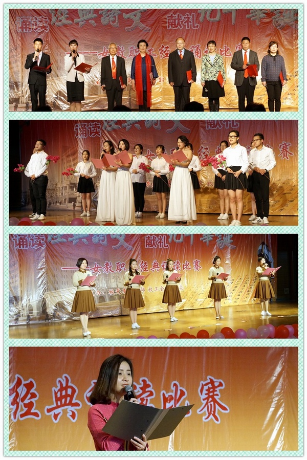 本网讯为学习贯彻党的十九大精神,进一步弘扬民族优秀文化,庆祝我校建校90周年,营造书香校园,3月28日下午,校党委宣传部、工会、女工委在学生活动中心联合举办了“诵读经典诗文 献礼九十华诞”女教职工经典诵读比赛活动。校党委常委、组织部长周旭,宣传部、校工会、团委负责人和各部门工会主席出席了此次活动。