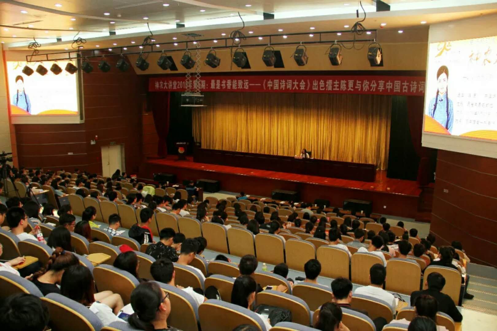 本网讯5月21日晚,“中国诗词大会”擂主选手、“第二届中华学子青春国学荟”形象代言人陈更做客我校建校90周年系列报告会--2018年第5期神农大讲堂,在图书馆第一报告厅为我校师生带来了一场主题为“最是书香能致远”的精彩讲座,外国语学院党委书记姚莉、校党委宣传部副部长夏成云、校团委副书记任琪出席讲座,现场近500名师生参加此次讲座。