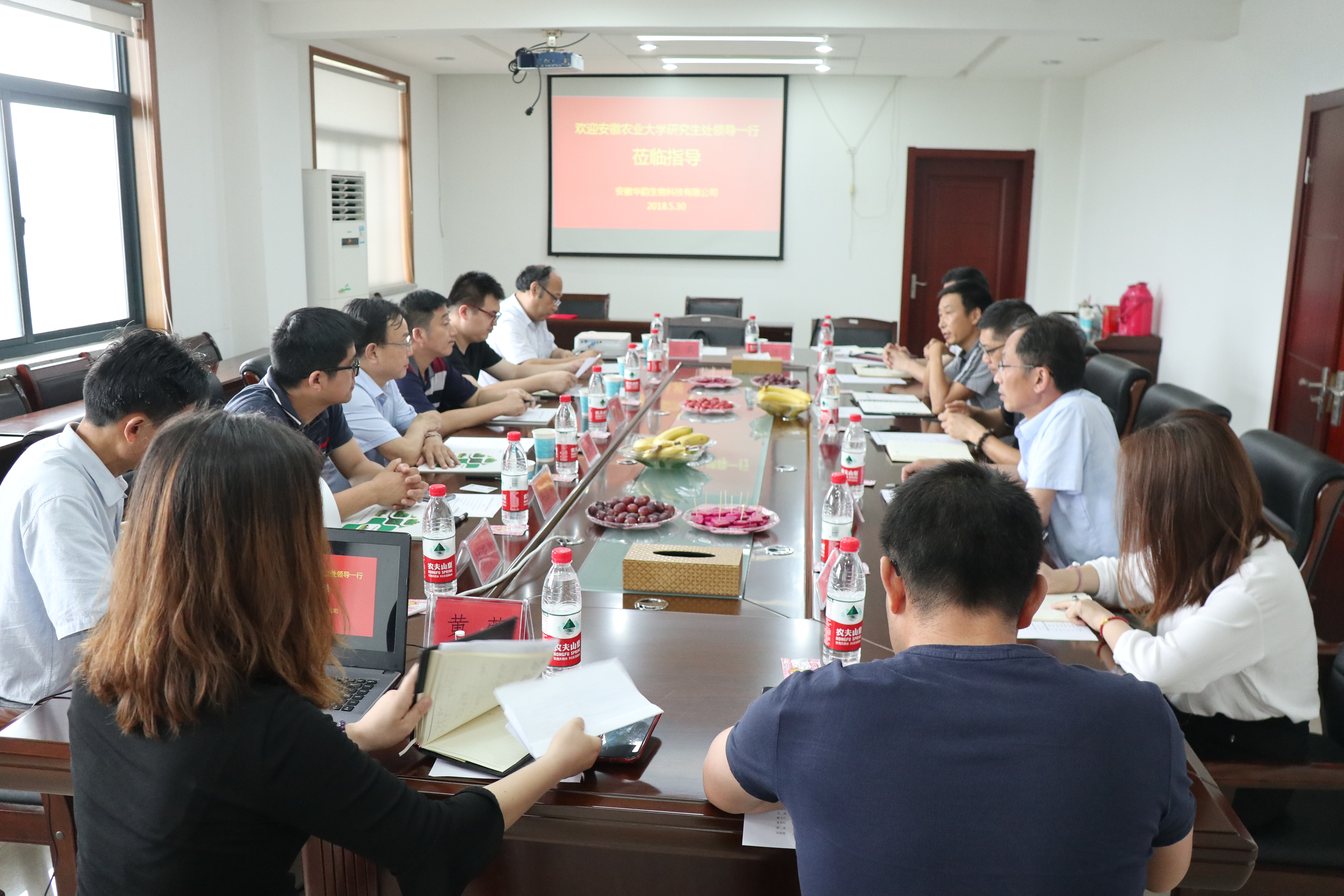 本网讯 “生物种业”专业硕士是我校“大学农业推广专业硕士”培养的重要形式之一,为保障“生物种业”专业硕士校外科研实践工作开展,切实做好人才培养改革探索,5月28日下午,研究生处处长祁克宗、副处长姜家生,生命科学学院党委副书记、副院长吴国卿,农学院相关教师和研究生处相关科室负责人赴安徽华韵生物科技有限公司共议专硕联合培养工作。肥西县科技局副局长张定聪、高新科主任孙昊,公司董事长王韵及相关人员出席会议。会议由公司总经理刘世年主持。