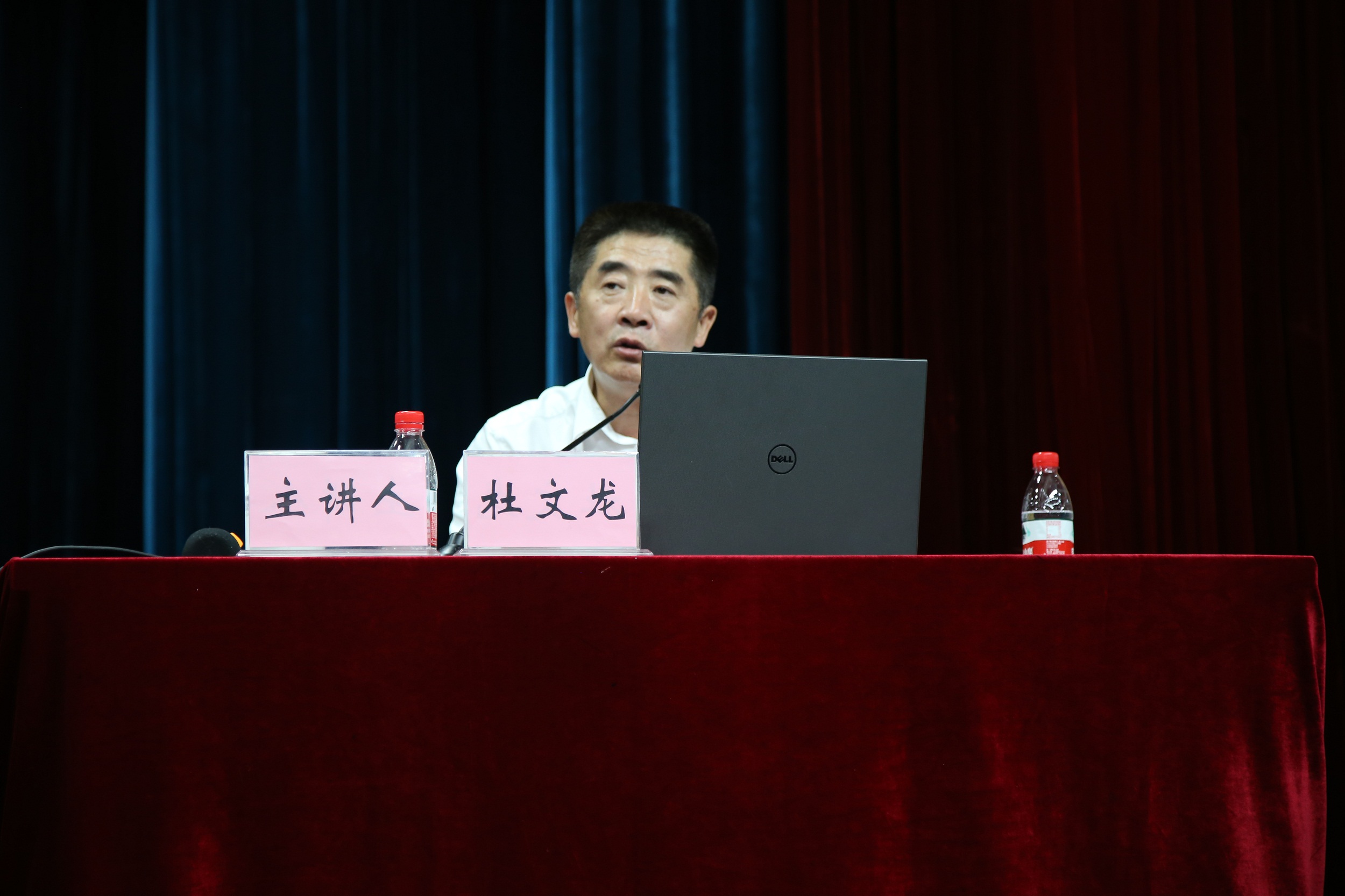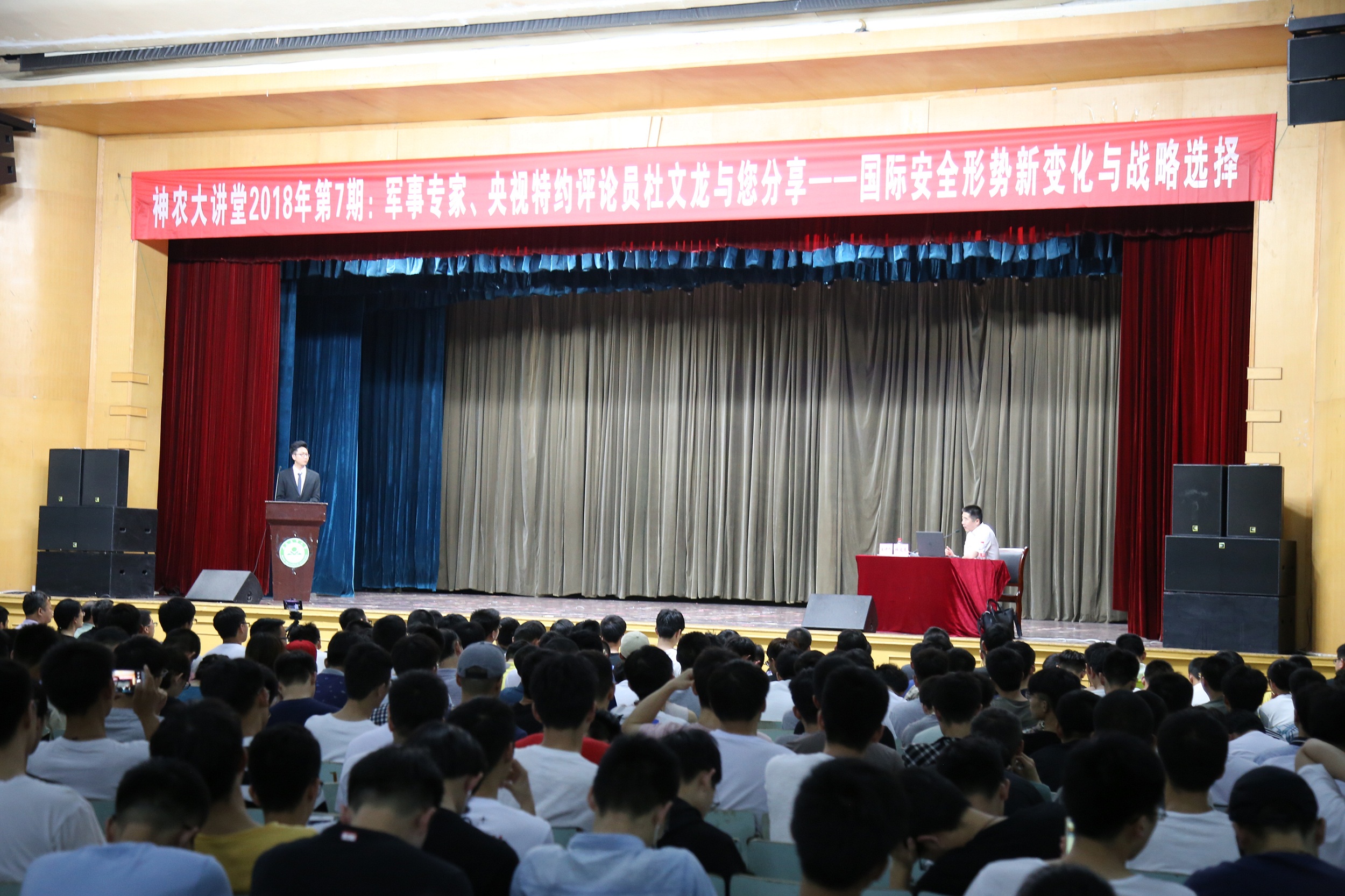 本网讯 6月1日晚,军事专家、央视特约评论员杜文龙教授做客我校庆祝建校90周年系列报告会——2018年第7期“神农大讲堂”,在校大礼堂为我校师生带来了一场主题为“国家安全形势新变化与战略选择”的精彩讲座。校党委组织部部长周旭、办公室主任刘凯、招生就业处处长刘海涛、武装部部长涂德润、外国语学院党委书记姚莉、校工会副主席吴冬梅、工学院党委副书记孙福、校团委副书记任琪出席讲座,现场近2000名师生参加了这场讲座。