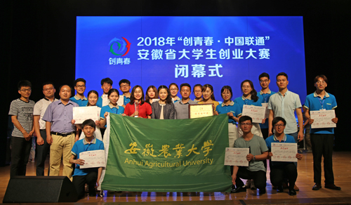 本网讯 6月2--4日,由共青团安徽省委、省教育厅、省人力资源和社会保障厅、省科协、省学联等单位共同主办的2018年“创青春”安徽省大学生创业大赛终审决赛在安徽财经大学举行。我校报送的12件作品荣获金奖6项,银奖1项,铜奖5项,学校荣获“优胜杯”,位列安徽省高校金奖榜第二。