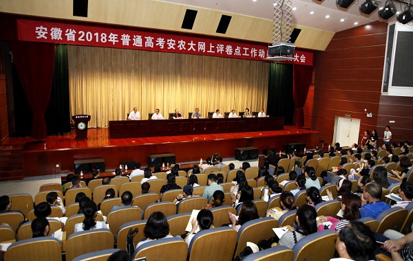 本网讯6月11日上午,安徽省2018年普通高考外语科目网上评卷动员大会在我校图书馆第一报告厅召开,这是安徽省普通高考实行网上评卷以来,我校连续第十三年承担此项任务。校党委常委、副校长蒋家平同志,省教育招生考试院副院长肖建荣同志出席会议。评卷教师及专家共近450人参加会议,会议由外语网评办公室主任、招生就业处处长刘海涛同志主持。