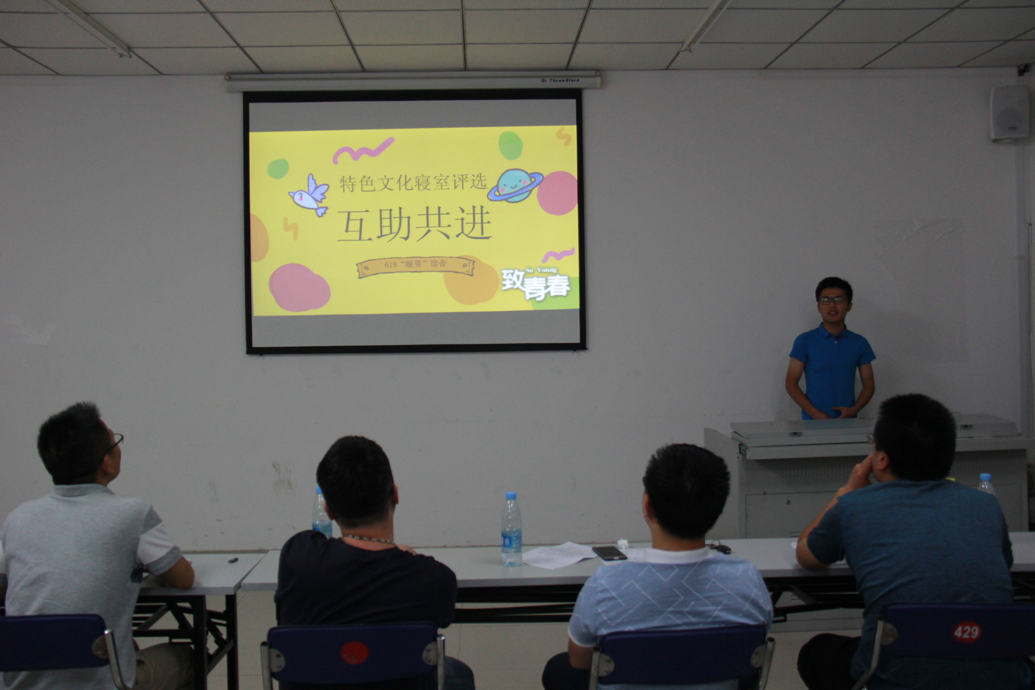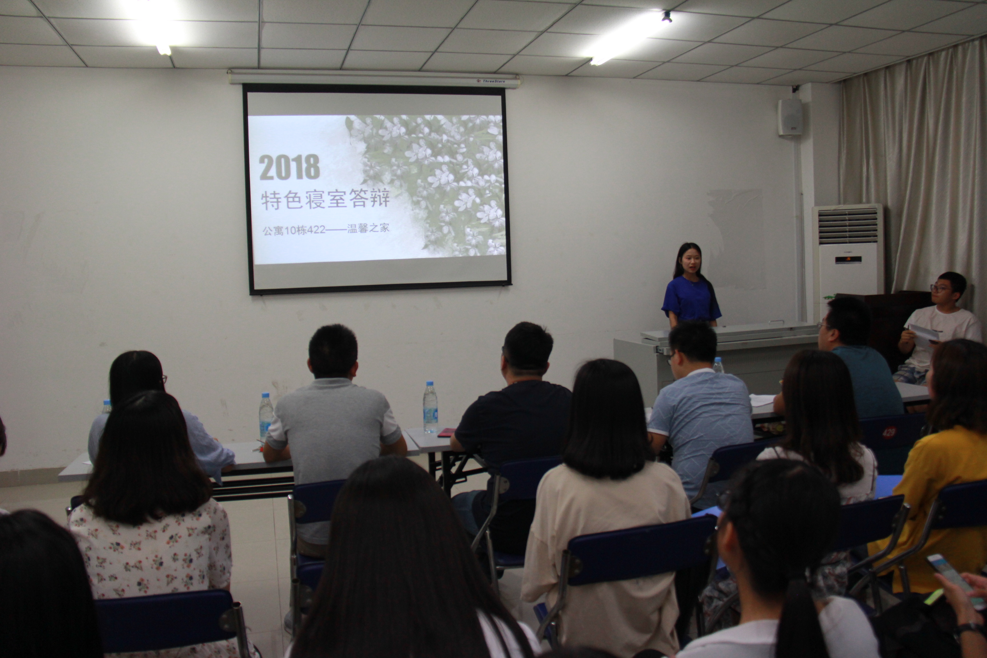 本网讯 6月13日-14日,我校2017-2018学年“特色文化宿舍”创建验收答辩会在欣苑四楼410、411、413教室、学生处201会议室举行。学工部(处)、后勤集团、学生公寓小区、各学院负责老师以及申报宿舍学生代表参加了答辩会。