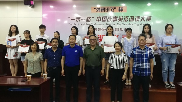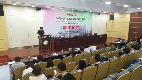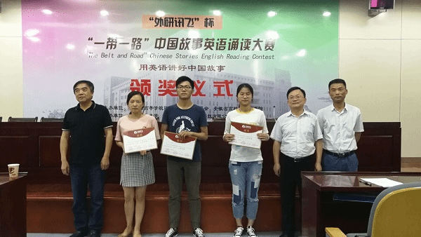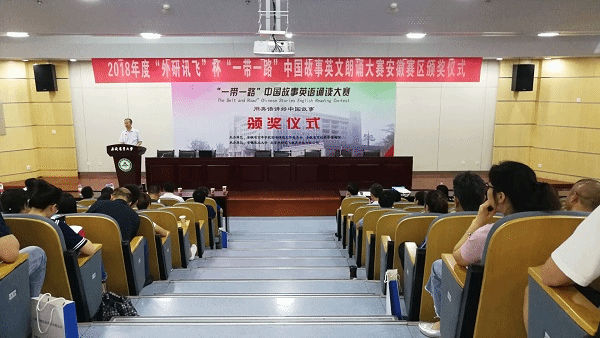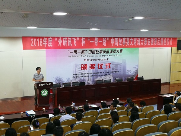 本网讯6月22日,2018年度“外研讯飞”杯“一带一路”中国故事英文诵读大赛安徽赛区颁奖仪式在我校图书馆2号报告厅拉开帷幕。本次大赛由安徽省高等学校图书情报工作委员会、安徽省高校数字图书馆主办,安徽农业大学图书馆、北京外研讯飞教育科技有限公司承办,省内30余所高校相关师生齐聚一堂,参加本次颁奖仪式。全场活动由合肥工业大学图书馆馆长陈科、我校图书馆馆长吴文革主持。