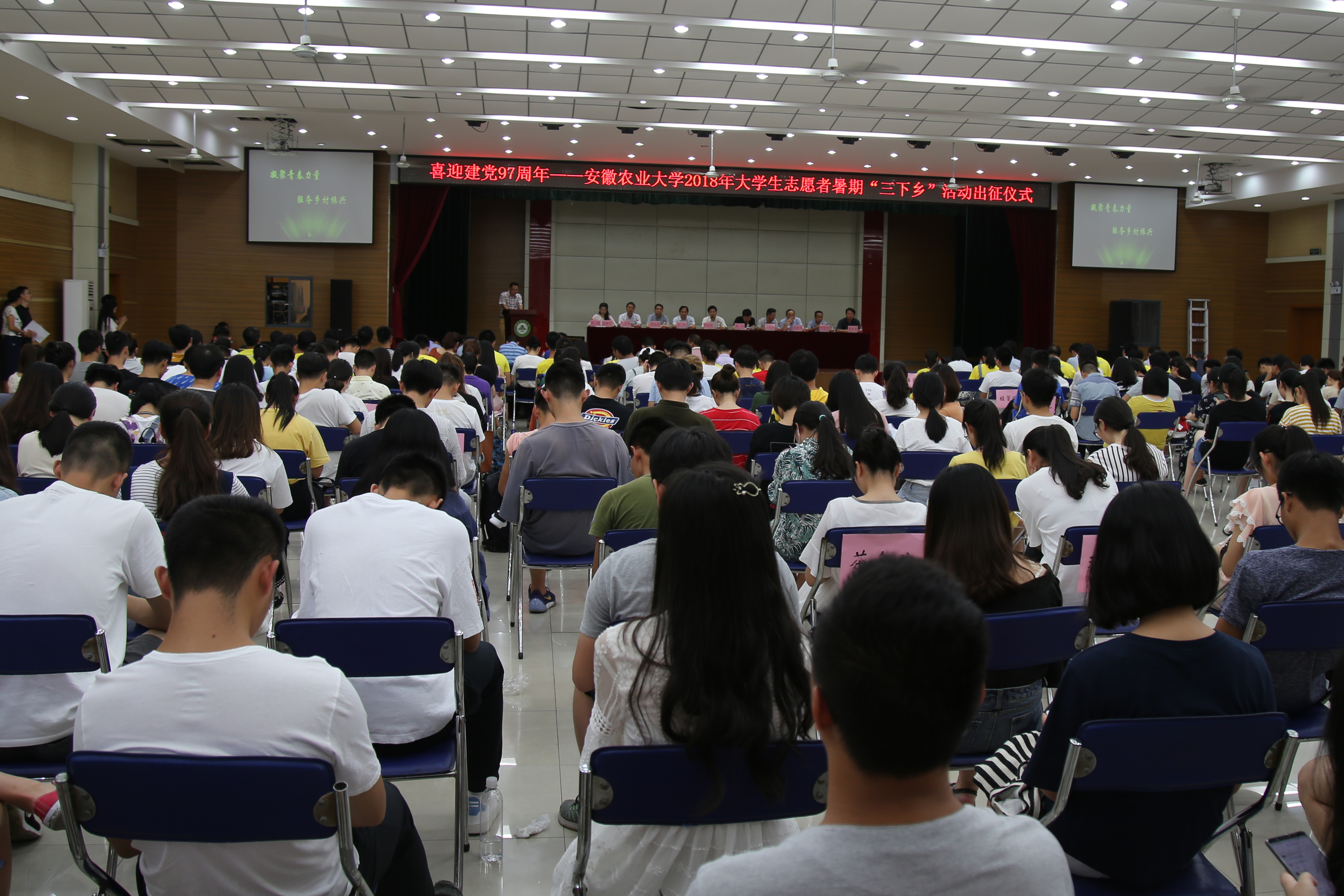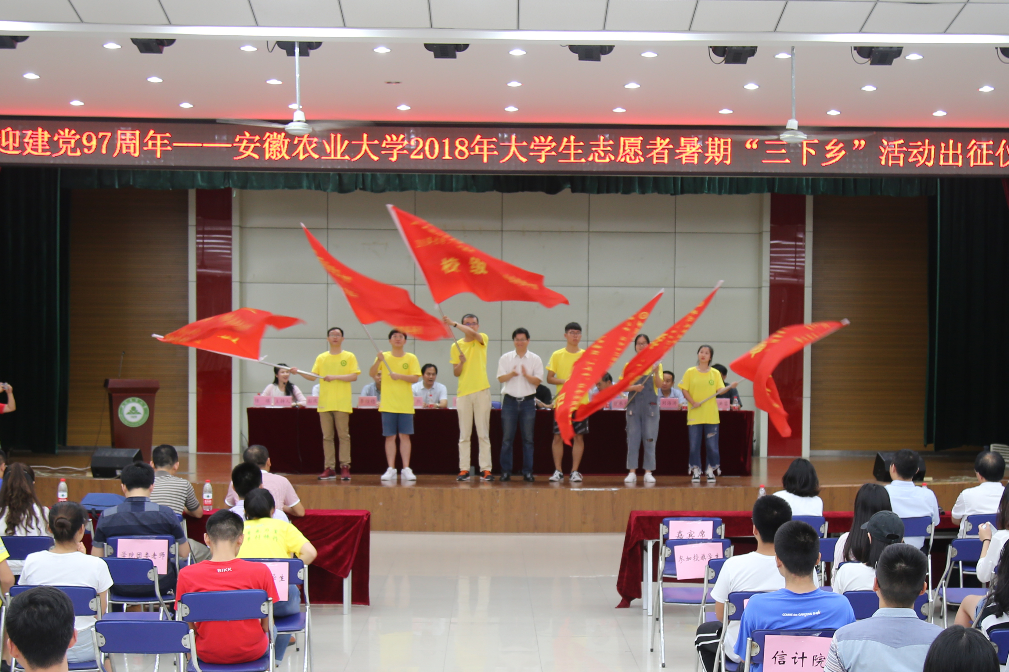 本网讯在建党97周年即将到来之际,6月29日下午,我校2018年大学生志愿者暑期“三下乡”社会实践活动出征仪式暨培训会在欣苑四楼学生活动中心举行。校纪委书记裴树东,办公室、组织部、宣传部、教务处、新农村发展研究院、学生处、招就处、马克思主义学院,各学院分管学生工作负责人、学院团委负责人,暑期“三下乡”校级、院级团队成员参加了出征仪式。仪式由校团委负责人主持。