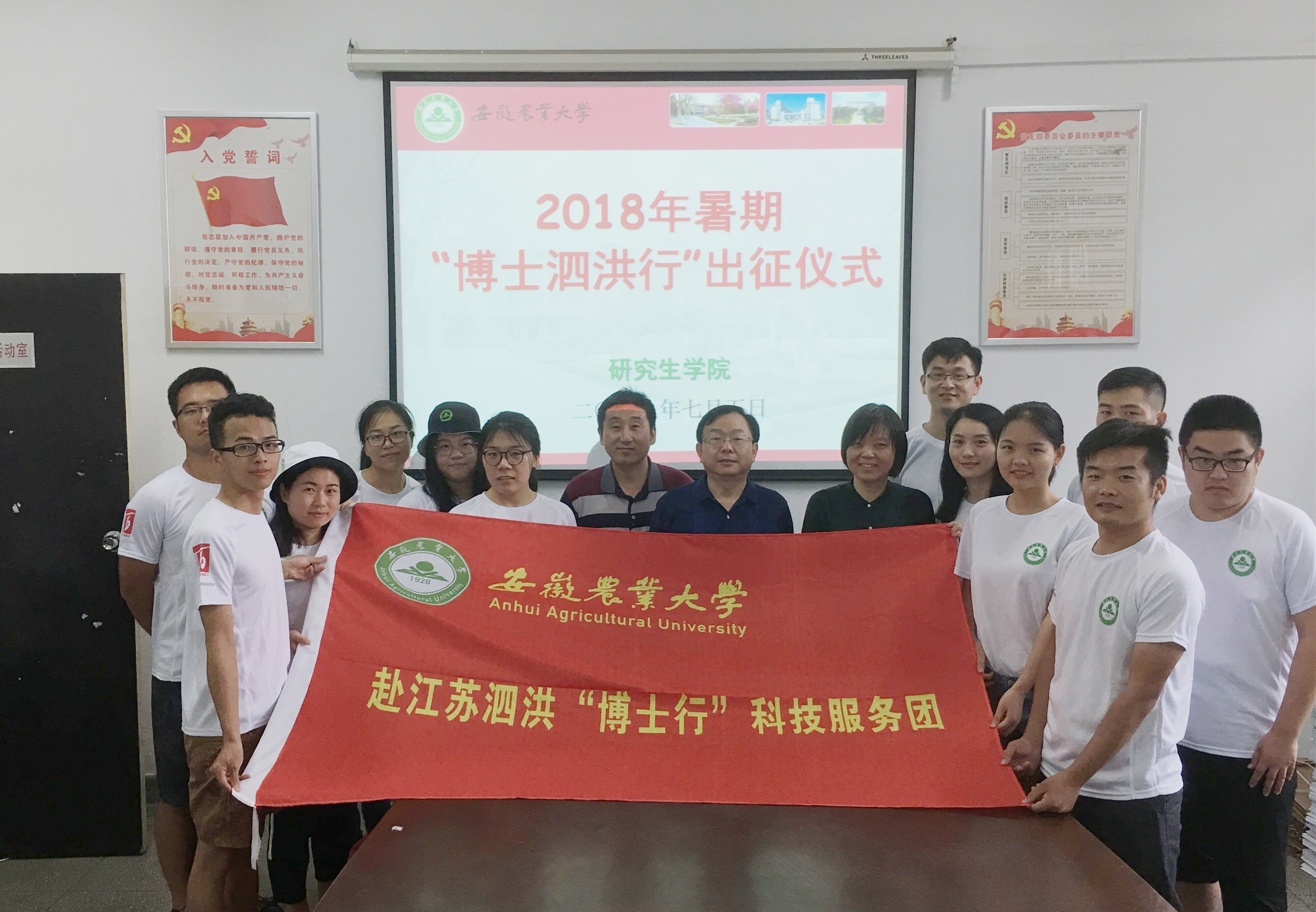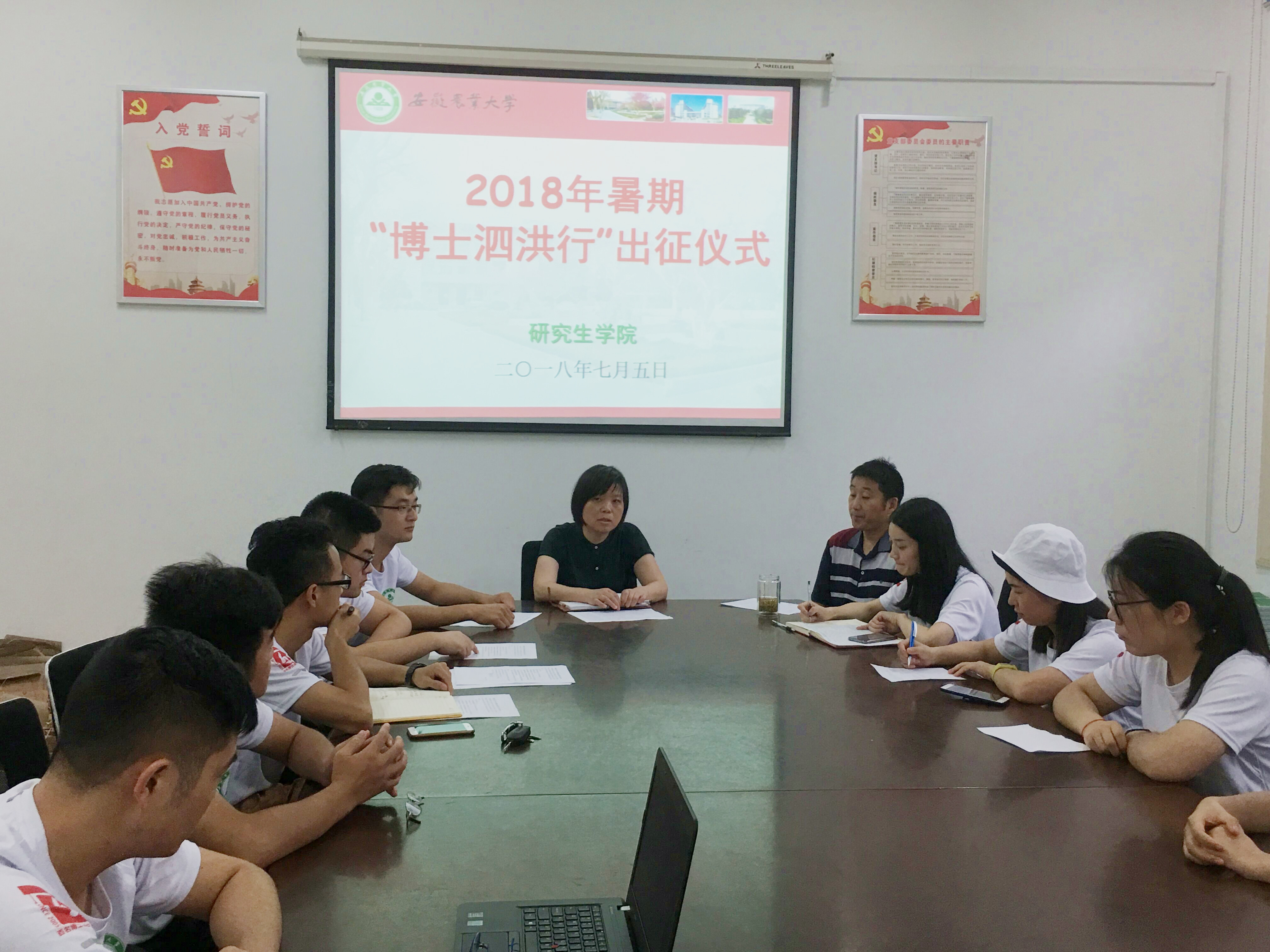 本网讯7月5日下午,我校2018年“博士泗洪行”研究生暑期科技服务活动出征仪式在研究生学院会议室举行。研究生学院党委副书记宋燕平、副院(处)长姜家生,学院相关老师,赴江苏泗洪的全体师生参加了仪式。