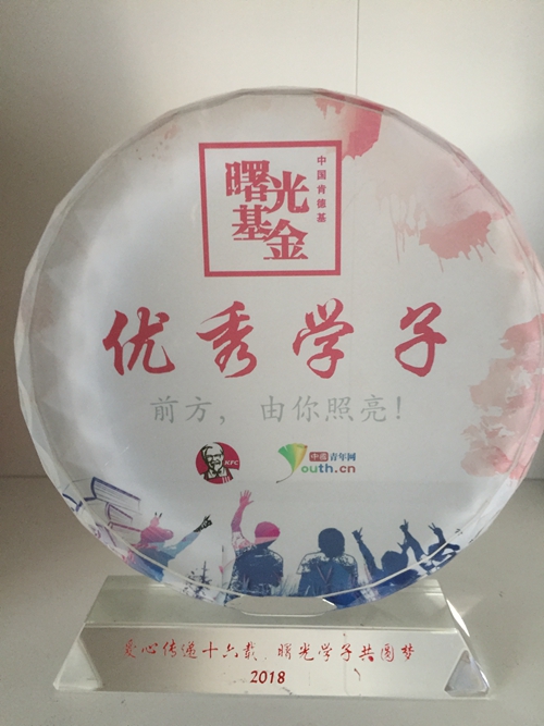 本网讯7月10日,由中国青年网和百胜中国共同举办的“爱心传递十六载 曙光学子共圆梦”肯德基曙光基金优秀学子颁奖典礼在北京举行,我校推选的2010级曙光学子朱广军、2011级曙光学子苗玉晴荣获“曙光基金优秀学子”称号,朱广军作为全国五位优秀典型代表之一赴北京参加颁奖典礼,并将自己的奋斗历程以演讲的形式通过网络分享给大学生等青年群体,鼓励更多的人自信自强,不负青年一代的使命,提高自身能力、造福社会。