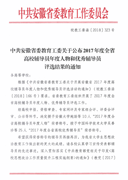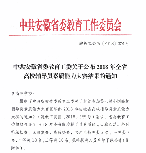 2013年至今,我校每年均有辅导员被评为安徽省高校辅导员年度人物或优秀辅导员荣誉称号,代表学校参加全省高校辅导员素质能力大赛(原为辅导员职业能力大赛)的选手均取得不俗的成绩,正是对我校辅导员队伍建设工作的充分肯定。(通讯员 程玉磊)