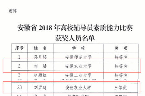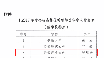 本网讯 日前,中共安徽省委教育工委发文公布了2017年安徽省高校辅导员年度人物和优秀辅导员评选、2018年全省高校辅导员素质能力大赛活动结果,我校人文社科学院专职辅导员张旭念荣获2017年安徽省高校辅导员年度人物荣誉称号、工学院专职辅导员刘灿和动物科技学院专职辅导员刘彦琦分获全省辅导员素质能力大赛特等奖和三等奖。