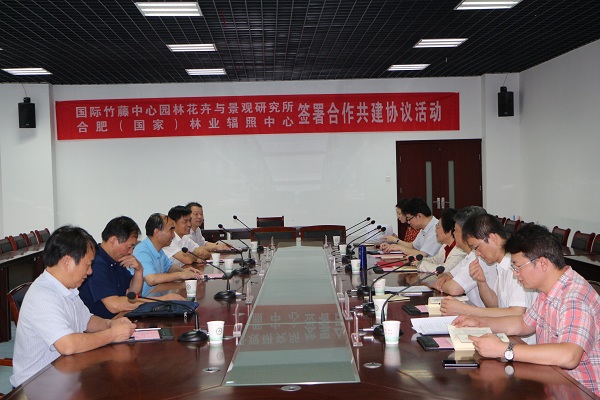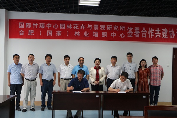 合肥(国家)林业辐照中心主任章铁和国际竹藤中心园林花卉与景观研究所副所长胡陶分别代表双方签订了合作共建协议。