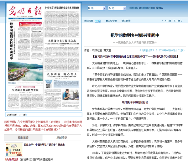 本网讯 今天出版的《光明日报》头版头条,以“把学问做到乡村振兴实践中——记安徽农业大学农业科技专家群体”为题,大篇幅报道了我校科技专家群体事迹。
