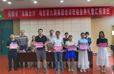 本网讯8月5日上午,安徽省“南南合作”项目第九期英语培训班结业典礼在安徽农业大学外国语学院502报告厅举行。省农委外事外经处处长韦艾平、调研员闫玉玲,我校外国语学院党委书记姚莉、院长孙志农以及全体培训教师和学员参加仪式。仪式由学校国际交流合作处处长姜红主持。