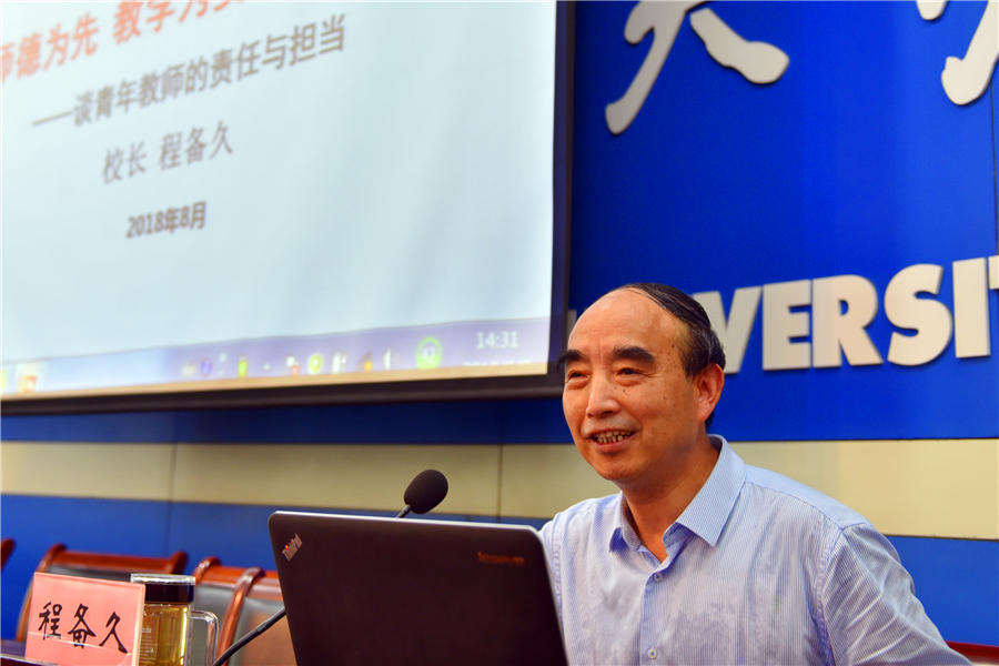 8月8日下午,程备久为新进教师作了《师德为先教学为要科研为基》的专题报告。他说,安徽农业大学是一所有追求、有声誉、有担当、有希望的大学,青年教师认识农大就要从了解学校历史沿革、办学特色、学科专业等方面出发,在熟悉农大、认识农大的过程中准确定位自我、找准发展方向。他指出,青年教师坚持师德为先,就是要坚守理想信念、坚守安农精神,坚守学术道德、坚守职业道德,不断提高自身人格魅力;坚持教学为要,就是要处理好教与学、学与用、教学与科研三者间的关系,把握创新教育与“互联网+教学”这两个关键点,增强个人教学能力;坚持科研为基,就是要在学识、心胸、毅力、方法四个词上下功夫,要用科研的源头活水更新教学内容,用科技成果服务和引领现代农业。他希望青年教师能坚持思想育人、道德育人、知识育人、和谐育人,并从情感、价值和利益关系上与学校建立荣辱与共的发展共同体,在推动有特色高水平农业大学建设的征程中共同出彩、共享成果。