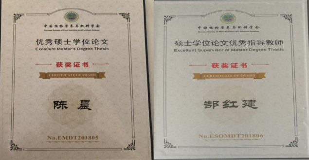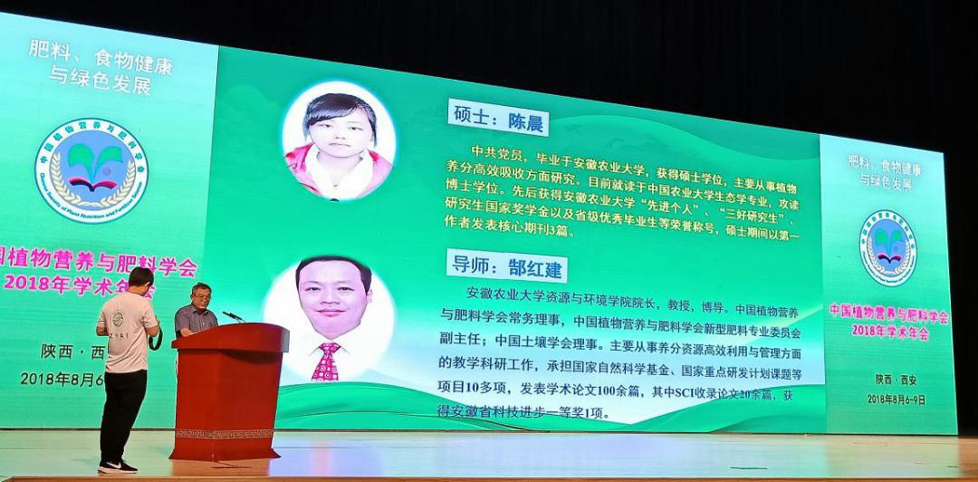 本网讯 近日,中国植物营养与肥料学会2018年学术年会在西安召开,共有来自全国高等院校、科研院所共1800名专家学者和研究生参会。会议进行了学会第二届优秀博士、硕士学位论文评选,我校资源与环境学院硕士研究生陈晨的学位论文《基于根系形态的水稻养分高效吸收品种初选》荣获优秀硕士学位论文称号,郜红建教授被评为硕士学位论文优秀指导教师。