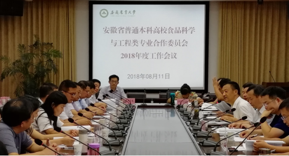 本网讯 8月11日,安徽省普通本科高校食品科学与工程类专业合作委员会2018年工作会议在校第三会议室举行。校纪委书记裴树东到会并代表学校致辞。来自全省包括合肥工业大学、安徽大学、安徽医科大学、安徽师范大学、安徽中医药大学、安徽科技学院等21所高校食品专合委委员及相关企业代表50余人参加了本次会议。校教务处处长李绍稳、副处长袁艺,茶与食品科技学院党委书记崔云、院长张正竹,安徽省食品科学与工程类专业合作委员会主任委员、生物技术中心主任杜先锋等出席会议,会议由食品专合委委员、茶与食品科技学院副院长周裔彬主持。