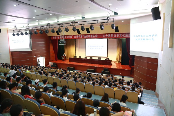 本网讯9月19日下午,“时代书苑·青禾讲坛”迎来了2018年第7讲(总第16讲),安徽省历史文化研究中心主任翁飞教授作客青禾讲坛,在图书馆第1学术报告厅为我校师生作了一场题为“大合肥的历史文化底蕴”的读书报告会。本次活动由图书馆、现代教育信息中心、人文社会科学学院、校团委主办,图书馆新媒体团队、图书馆学生服务中心团队、图书馆微传媒团队、青禾书店创业团队、青禾讲坛服务团队协办。