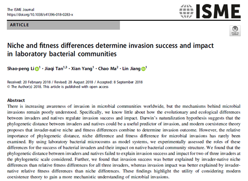 本网讯 9月25日,我校农田生态保育与污染防控安徽省重点实验室、资源与环境学院和美国佐治亚理工学院等单位合作研究成果“Niche and fitness differences determine invasion success and impact in laboratory bacterial communities”在《ISME Journal》(5年影响因子11.663)上在线发表。该论文系统研究了微生物外来种和土著种的亲缘关系、生态位差异和适合度差异对细菌入侵及其危害程度的影响,揭示了物种之间的差异性如何调节外来微生物的入侵及其危害,在揭示微生物的入侵机制上取得重要突破,并为利用现代物种共存理论预测和防控微生物入侵提供了重要理论依据。我校是该文的第二完成单位,资源与环境学院马超博士为共同第一通讯作者。