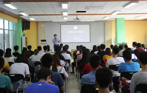 本网讯 9月26日下午,我校知名校友、辅音国际董事长赵明在大学生创客空间A区路演大厅为我校学子带来了一场主题为“创新创业不是梦”的创业沙龙。校团委负责人与现场百余名有创业想法的同学一同参与了创业沙龙。