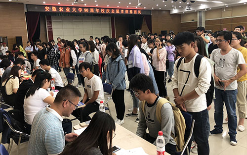 本网讯 为协助做好校庆期间各项服务保障工作,营造校庆人人参与的浓厚氛围,进一步激发大学生的爱校荣校情怀,9月27日中午,我校在欣苑四楼学生活动中心进行90周年校庆志愿者招募面试工作,来自全校16个学院1800余名学生分别参加了引导咨询志愿者、嘉宾联络志愿者、礼仪志愿者、新闻报道志愿者、综合岗位志愿者5个类别的面试。