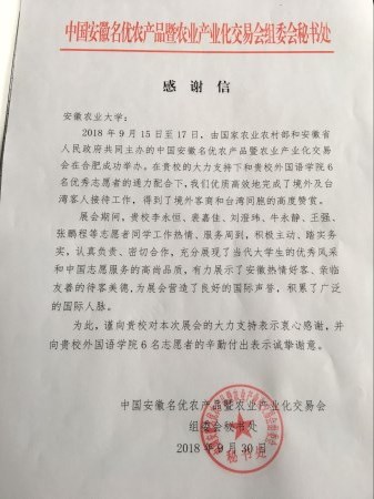 本网讯 近日,中国安徽名优农产品暨农业产业化交易会在合肥举办,应组委会要求,我校外国语学院派出六名学生志愿者参与服务,为参展的各国外商、驻华使节提供陪同翻译、商务洽谈等志愿服务。组委会秘书处专门给我校外国语学院发来一封《感谢信》,对学生志愿者的周到服务表示感谢。