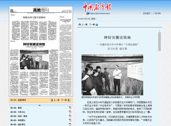 本网讯 今天出版的《中国教育报》高教周刊头版,以“种好安徽这块地——安徽农业大学33年践行‘大别山道路’”为题,报道了我校坚持走“大别山道路”的事迹。