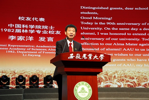 李家洋代表20余万校友向母校献上深深的祝愿。他说,今天回到母校,感受到,母校严谨的校风没有变,赋予每个学子的情怀没有变,争创一流的气魄更大,追求卓越的理想更高,“造就人才、改良农业、救济农村”的初心更坚定。九十年的播种,九十年的耕耘,九十年薪火相传,母校已成为一片沃土,已成为人才的摇篮,谱写了壮美的育人华章。他说,母校是学子归来的港湾,是寄托精神的家园。回首成长历程,任何成绩的取得,都得益于母校的悉心培养,离不开当年师长的言传身教。母校培养了自己,如今能够用自己取得的成绩为母校的荣誉增砖添瓦,感到很自豪。他代表校友祝福母校的未来更辉煌。