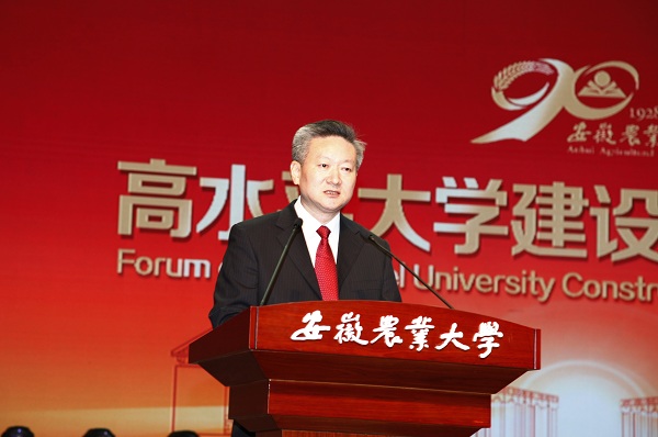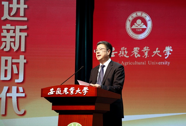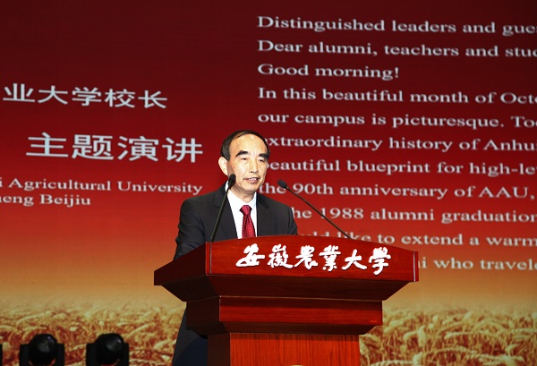 校党委副书记、校长程备久以《不忘创校初心 牢记时代使命 奋力开创特色鲜明的高水平农业大学》为题发表了主题演讲。他指出,90年栉风沐雨、薪火相传,形成了坚韧执着的“安农精神”;90年传道授业、立德树人,凝聚了蓬勃发展的“安农力量”;90年矢志创新、勇攀高峰,创造了争创一流的“安农业绩”;90年扎根大地、服务“三农”,探索了特色办学的“安农道路”。程备久强调,“到2028年建校100周年时,把学校建成农林学科国内一流、若干优势学科有重要国际影响、综合办学实力居同类院校前列的特色鲜明的高水平农业大学”的奋斗目标,是全体安农人的“百年愿景”。实现“百年愿景”,加强党的领导是根本保证,坚持立德树人是根本任务,推动内涵发展是本质要求,服务乡村振兴是时代担当,全体安农人将团结拼搏、奋勇争先,迈向新征程、创造新辉煌,奋力书写特色鲜明的高水平农业大学的时代华章。