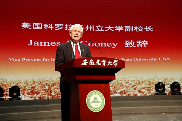 JamesA.Cooney代表全球30多个国家的安徽农大国际合作伙伴向学校表达谢意,感谢学校的卓越步伐。他表示,过去的十年间,科罗拉多州立大学同安徽农大紧密合作,亲眼见证了安徽农大争创一流的不懈追求,对安徽农大取得的成果表示赞赏。他希望与安徽农大合作前行,携手共进。
