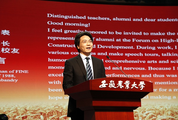 校党委书记江春主持了论坛。他指出,支撑学校发展最深厚、最强大的动力,是学校拥有的优秀老师。他们把人才植根江淮大地,把科研做在田间地头,把论文写在农民心坎,他们是学校办学之本。90年来为社会培养了一大批优秀人才,他们在不同的岗位,努力工作,回报社会,取得了丰硕成果。他们饱含对母校的深厚感情,始终关心和支持学校的发展。他强调,庆祝建校90周年,不仅是对学校发展历史的总结,更是对未来美好前景的展望。进入新时代,站在新起点,学校将高举习近平新时代中国特色社会主义思想伟大旗帜,始终坚持社会主义办学方向,落实立德树人根本任务,深入贯彻全国教育大会精神,紧紧抓住省部、省局共建和国家实施乡村振兴战略、“双一流”建设等重大机遇,在省委省政府的领导下,朝着“特色鲜明的高水平农业大学”的目标奋力前行,为全面建设现代化五大发展美好安徽、全面建设现代化强国做出新的更大贡献。