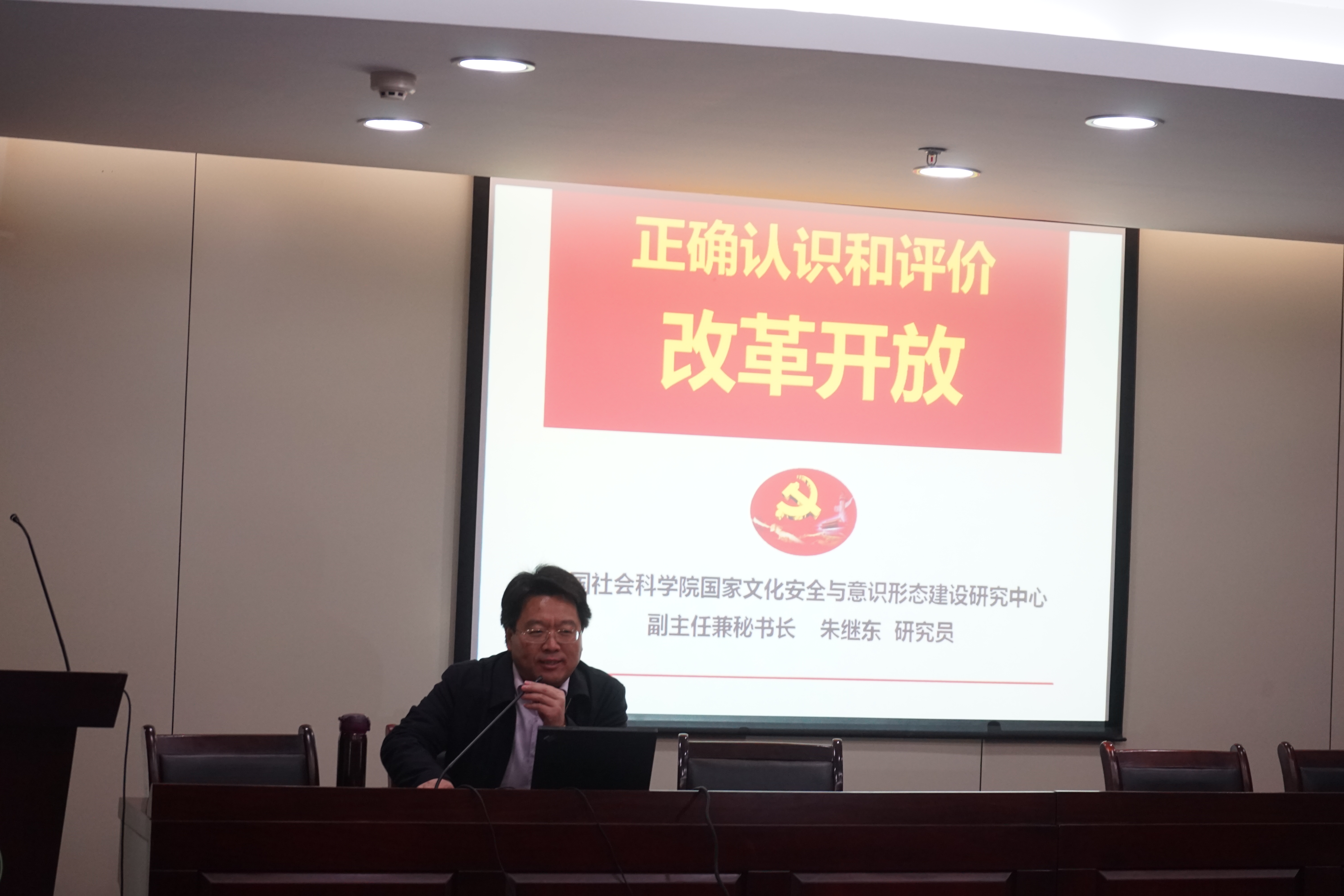本网讯 11月13日下午,中国社科院朱继东研究员应邀来校,在校图书馆第三报告厅作了题为《正确认识和评价改革开放》的学术报告。报告会由校学工部(处)和人文社科学院共同举办。校学工部(处)负责人、各学院分管学生工作负责人、辅导员和研究生等近100人参加了报告会。报告会由人文社会科学学院院长方章东主持。