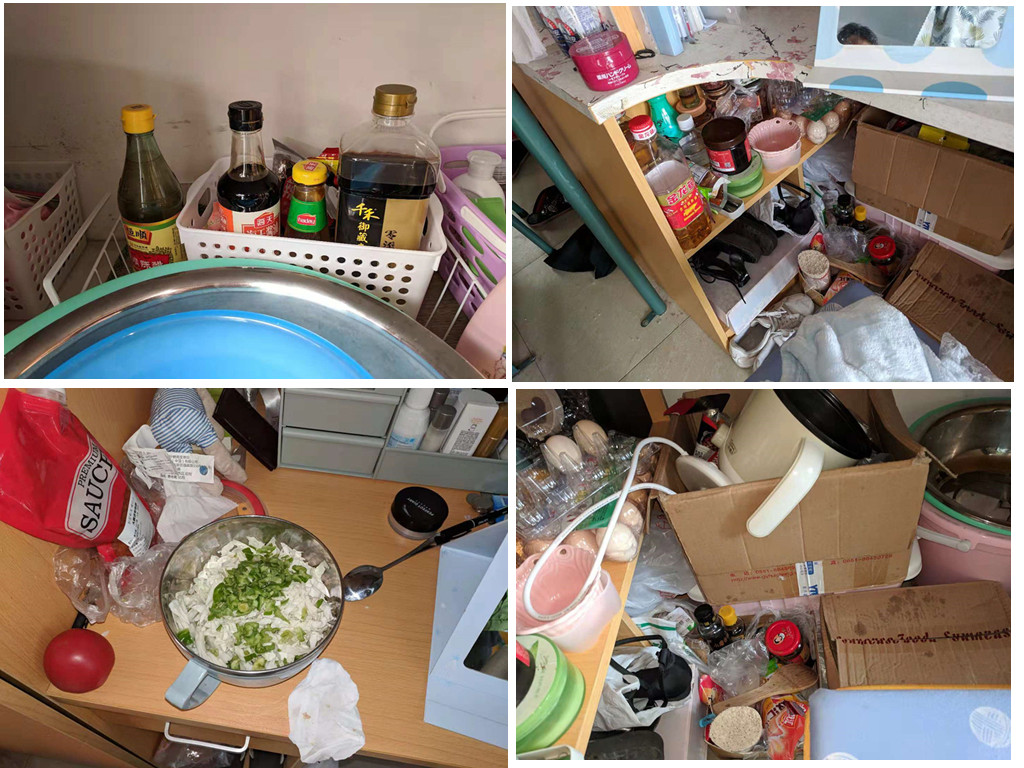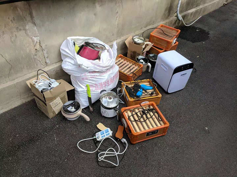 本次“回头看”选择了前期检查问题突出的两个学院所在的校内七、八号楼,经过对每间宿舍进行仔细检查,共查缴:可调节功率多用插座6个,电饭锅20个,多功能暖脚器5只,烘靯器4副,挂烫机1台,管制刀具1把,小型电冰箱1台(其中大部分为“三无”产品),共涉及29间寝室,另外有相当部分寝室摆放有米、面条、油盐酱醋等食材,却未发现炊具。“回头看”结果显示,相比前期检查隐患不仅未消除,且越发严重。