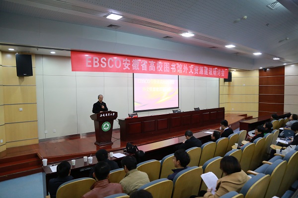本网讯11月22日下午,EBSCO安徽省高校图书馆外文资源建设研讨会在我校图书馆第2学术报告厅召开,全省各高校图书馆领导等100多人参加了本次研讨会,共同探讨在“双一流”和高水平大学建设的背景下,资源建设和服务方式怎样本地化才能更好地助力学科服务。会议由安徽省高校图工委、安徽省高校数字图书馆主办,我校图书馆、合肥蓬桉数据技术服务有限公司承办,我校图书馆馆长吴文革主持会议。
