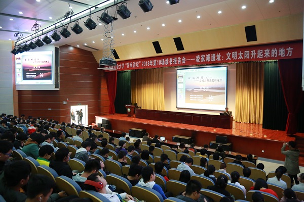 本网讯11月28日下午,“时代书苑·青禾讲坛”迎来了2018年第10讲(总第19讲),著名考古学家,安徽省人民政府文史馆馆员、中国社会科学院古代文明研究中心客座研究员、安徽省文物考古研究所研究员、安徽大学兼职教授、安徽省玉石文化研究会会长张敬国作客青禾讲坛,在校图书馆第一学术报告厅为我校师生做了一场题为“凌家滩遗址:文明太阳升起来的地方”的读书报告会,,550多名师生参加了报告会。此次活动由校团委、校图书馆、现代教育信息中心、人文社会科学学院主办,图书馆新媒体团队、图书馆学生服务中心团队、图书馆微传媒团队、青禾书店创业团队、青禾讲坛服务团队协办。