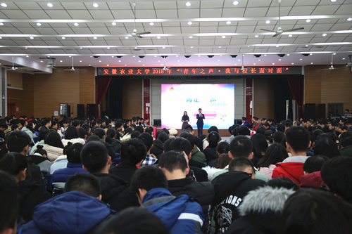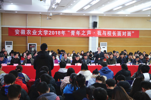 反映青年呼声,回应青年诉求,维护青年权益,服务青年成长。12月12日下午,2018年“青年之声·我与校长面对面”活动在欣苑活动中心举办。校长程备久、纪委书记裴树东、副校长马传喜、副校长韩军与同学们倾亲互动,相关单位负责人、各学院分管学生工作负责人以及来自各学院的300余名学生代表参加了活动。